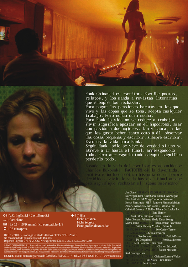 Estas imágenes corresponden a la edición comercial de "Factótum", cuyo Copyright pertenece a la compañía distribuidora y/o productora cinematográfica (Cameo).